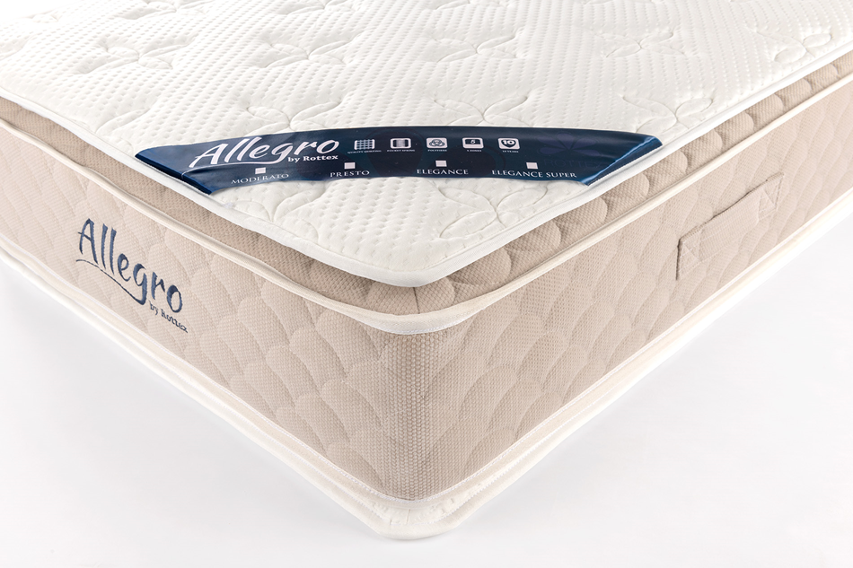 Az Allegro Moderato táskarugós matrac az Allegro zsákrugós matraccsaládban a kivételes luxust és a páratlan kényelmet jelenti. A Moderato matrac mindkét oldalán megtalálható top pillow extra párnázó réteg az igazi luxus komfortot kölcsönzi a matracnak és a határozott 5 zónás német zsákrugó rendszernek köszönhető stabilitás, alátámasztás és ellenállás ellenére az Allegro Moderato matrac egy kellemesen lágy matrac, amely azonban képes és alkalmas arra, hogy a gerincoszlopot a megfelelő alátámasztásban részesítse az éjszakai pihenés során.