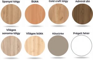 Admiral dió, Bükk, Gold craft tölgy, Kőszürke "matt", Prégelt fehér "matt", Spanyol tölgy, Világos bükk, Világos Sonoma tölgy